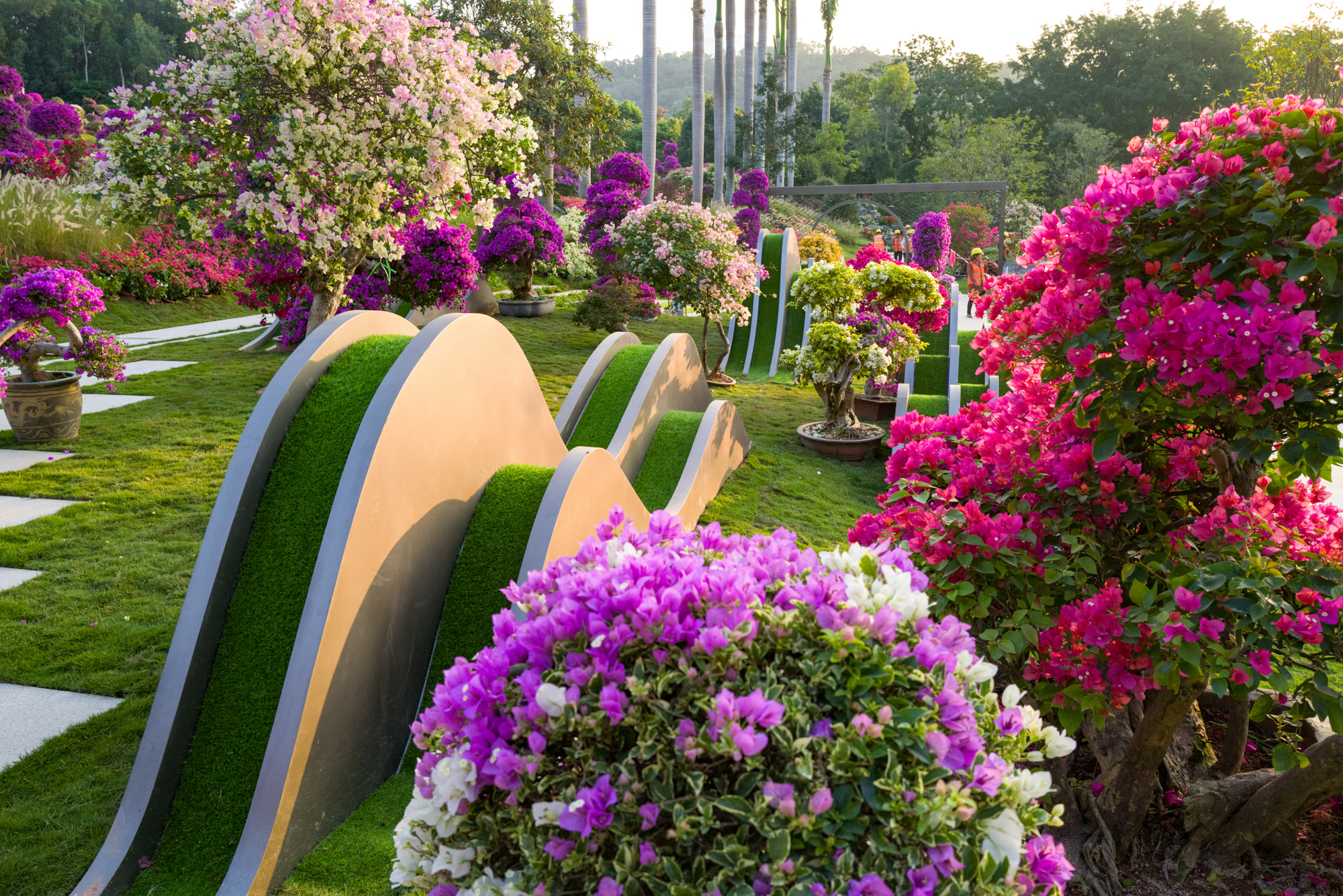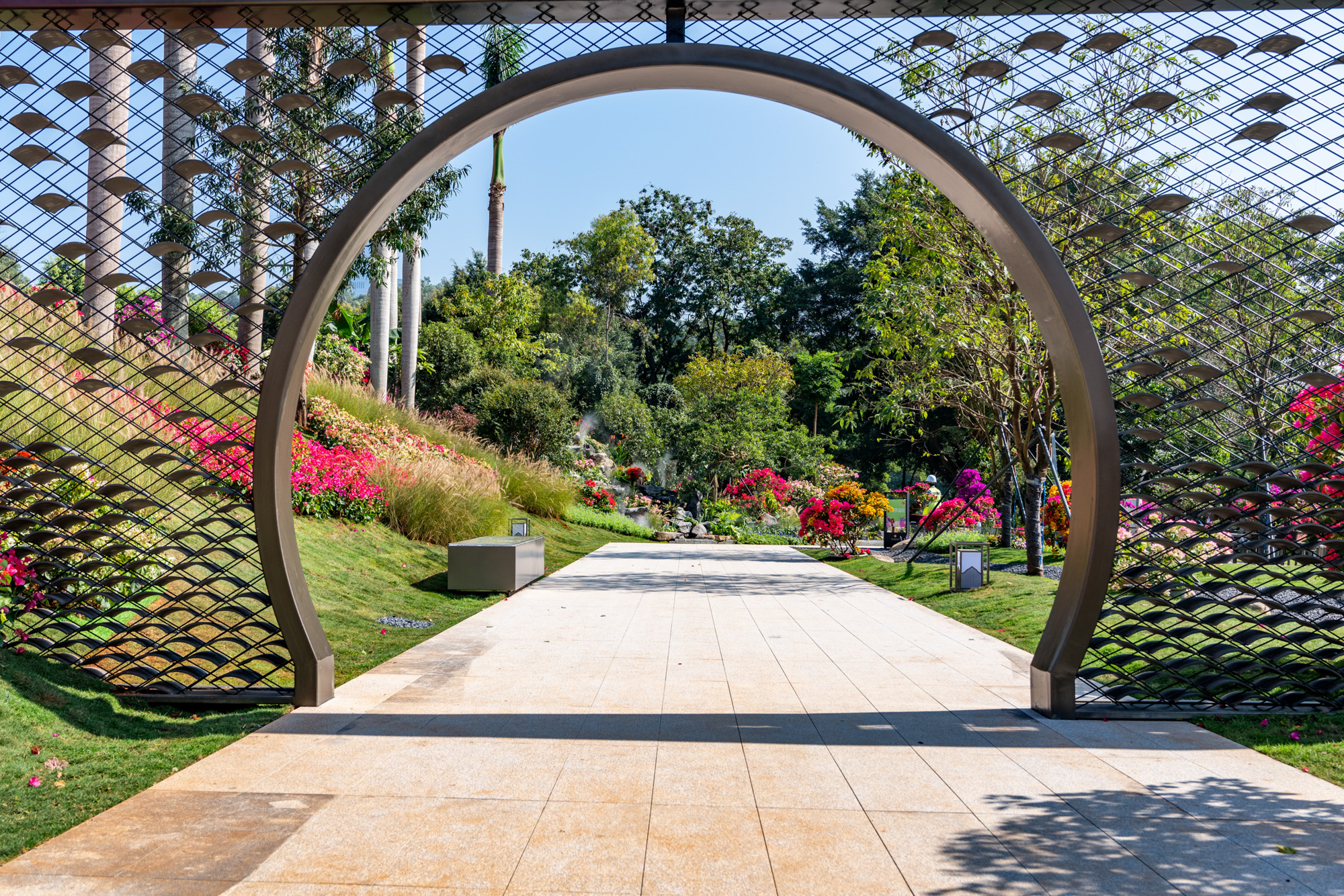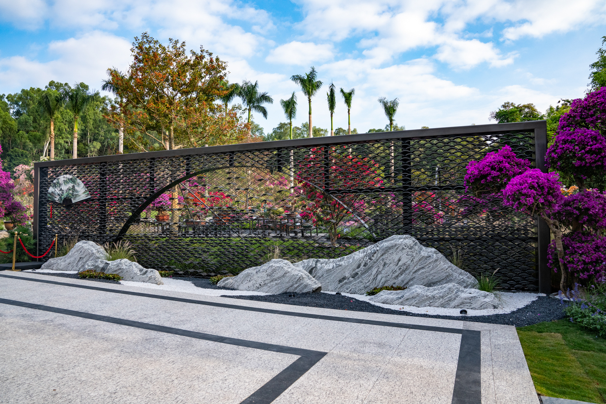展區(qū)在展示簕杜鵑自然造型之美的同時,借鑒中國古典園林的新中式設(shè)計意念,通過對景墻、枯山水、框景及微地形精心布局,中式青瓦元素的應(yīng)用,營造曲徑通幽、一步一景的系列景觀空間,讓市民在其中體驗沉浸式的賞花體驗。