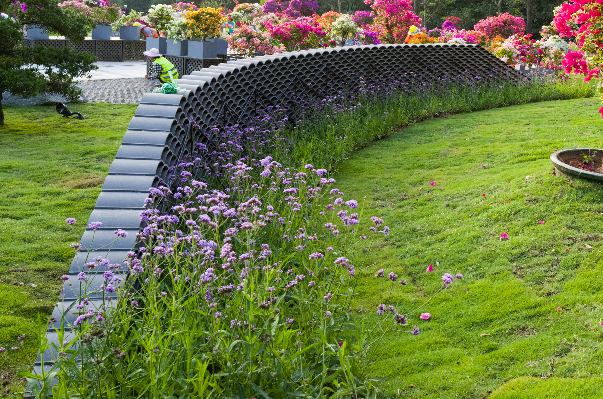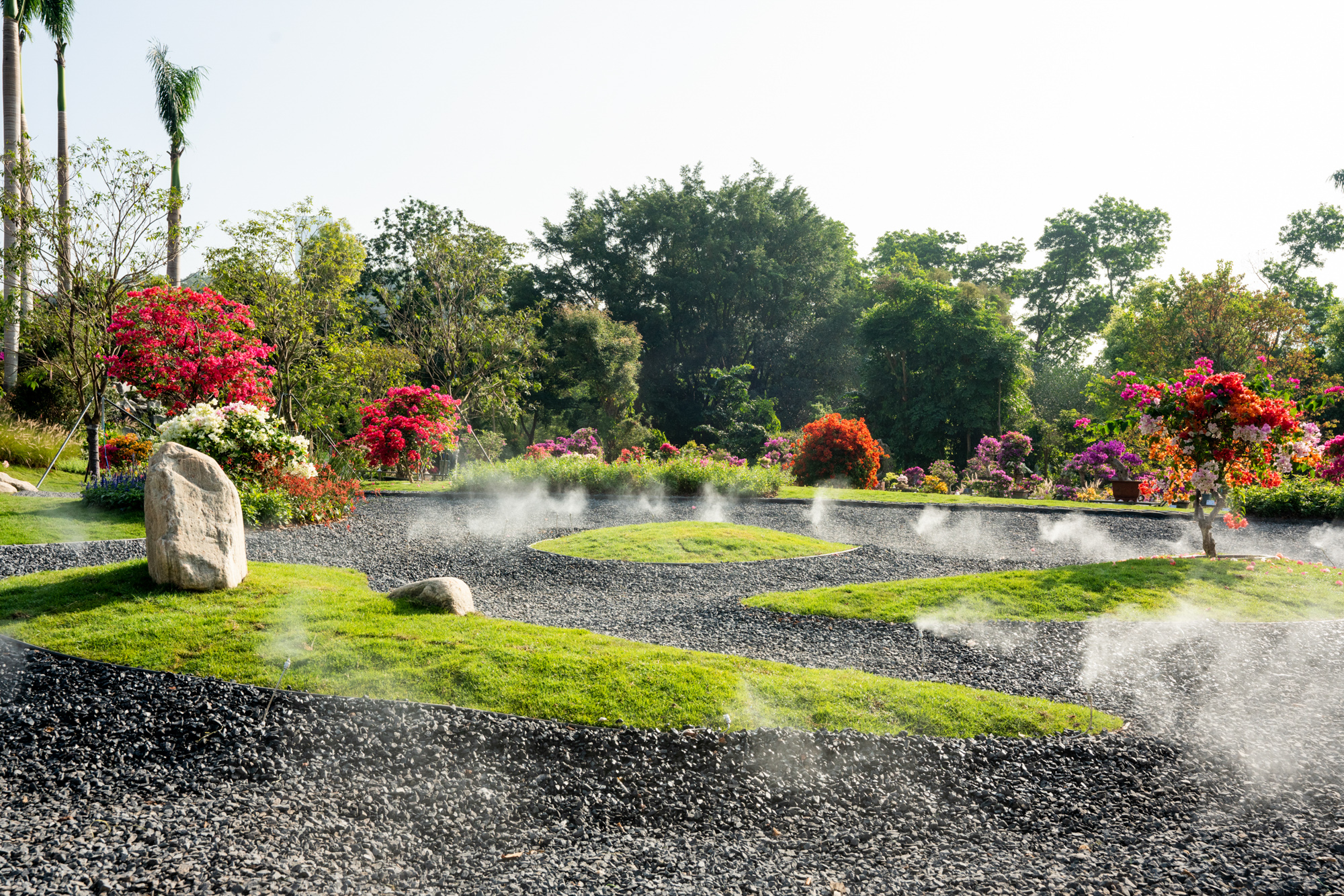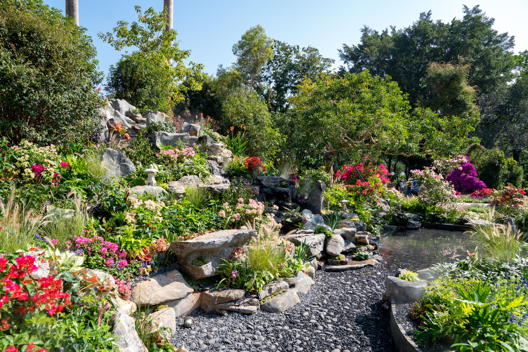 展區(qū)在展示簕杜鵑自然造型之美的同時,借鑒中國古典園林的新中式設(shè)計意念,通過對景墻、枯山水、框景及微地形精心布局,中式青瓦元素的應(yīng)用,營造曲徑通幽、一步一景的系列景觀空間,讓市民在其中體驗沉浸式的賞花體驗。