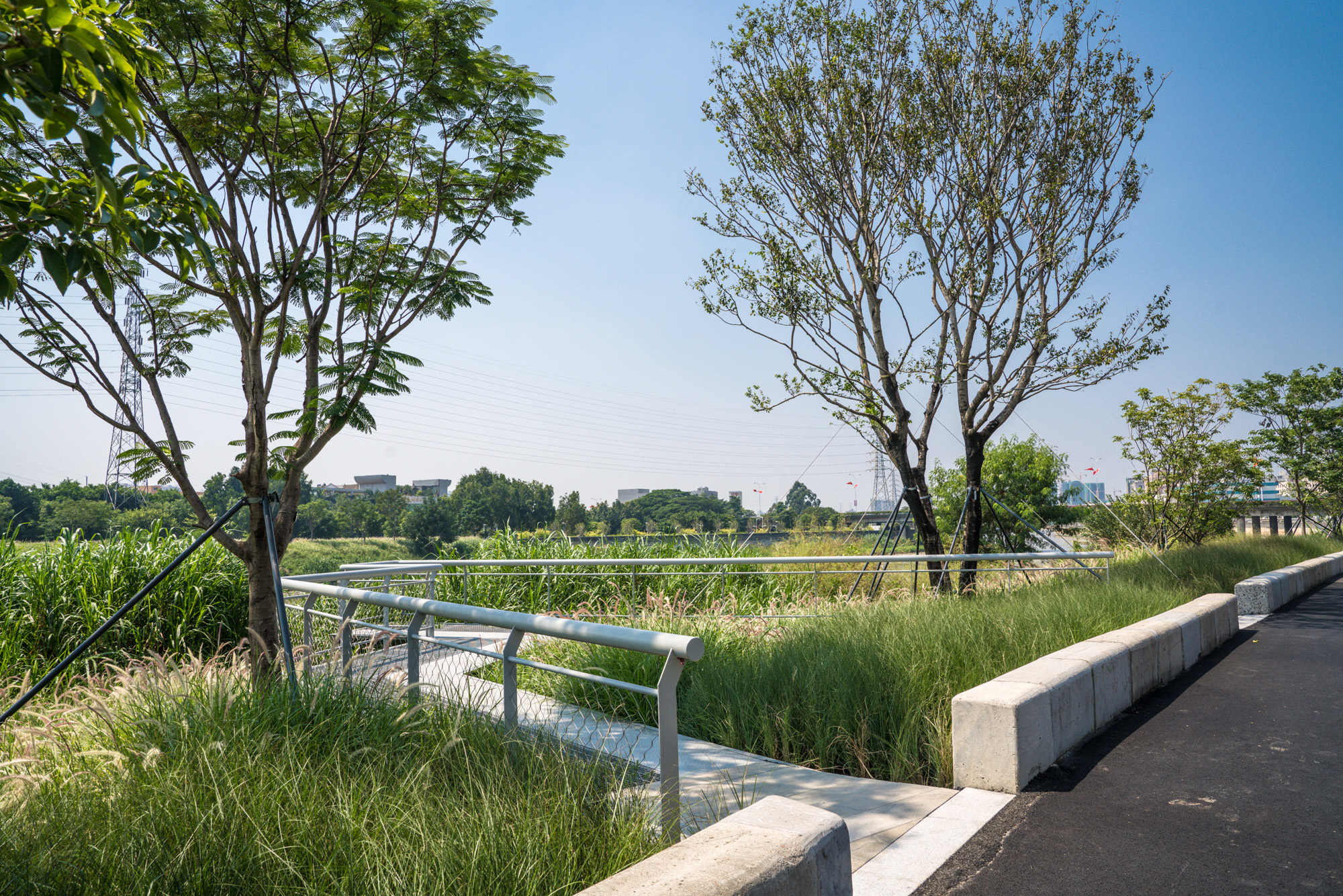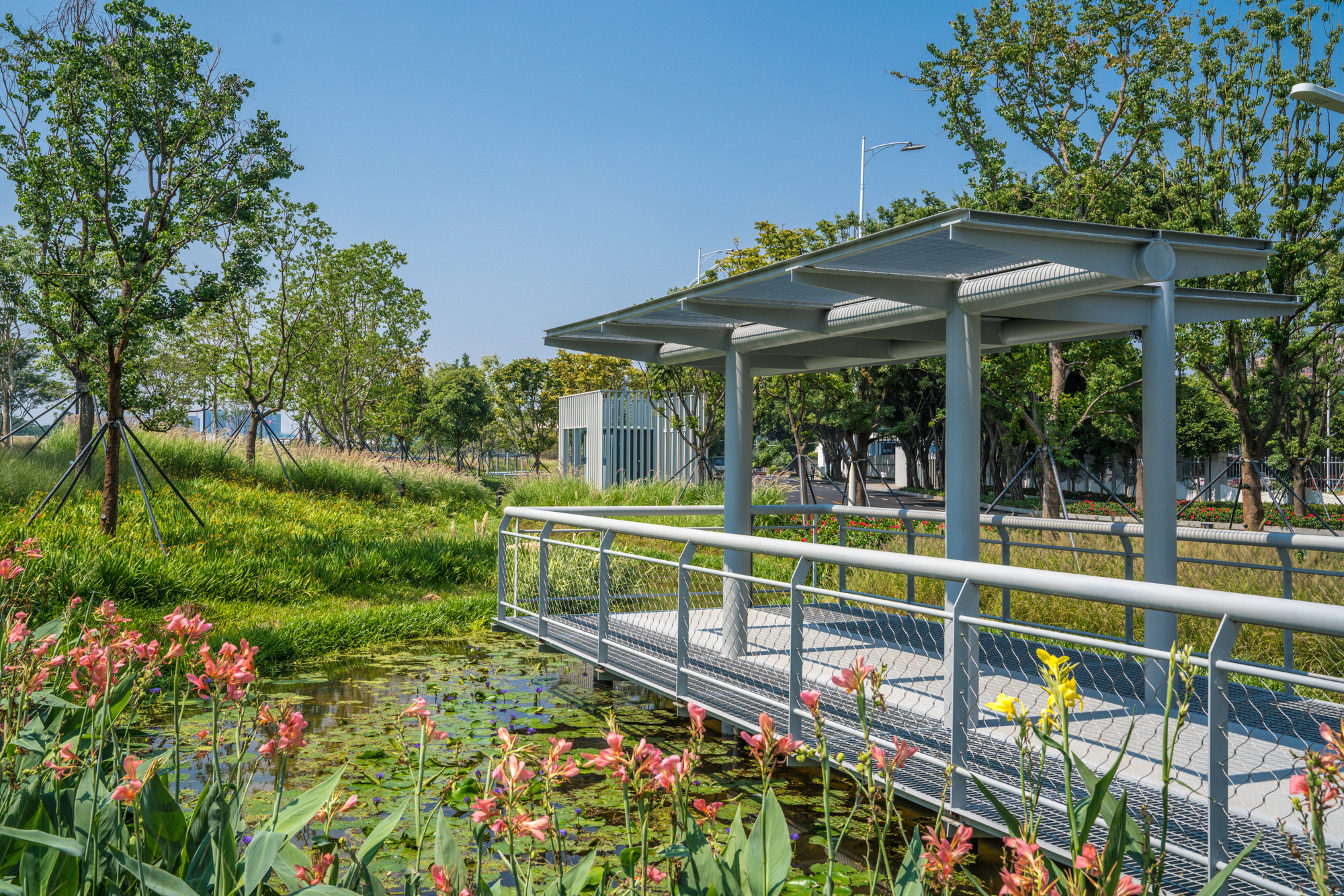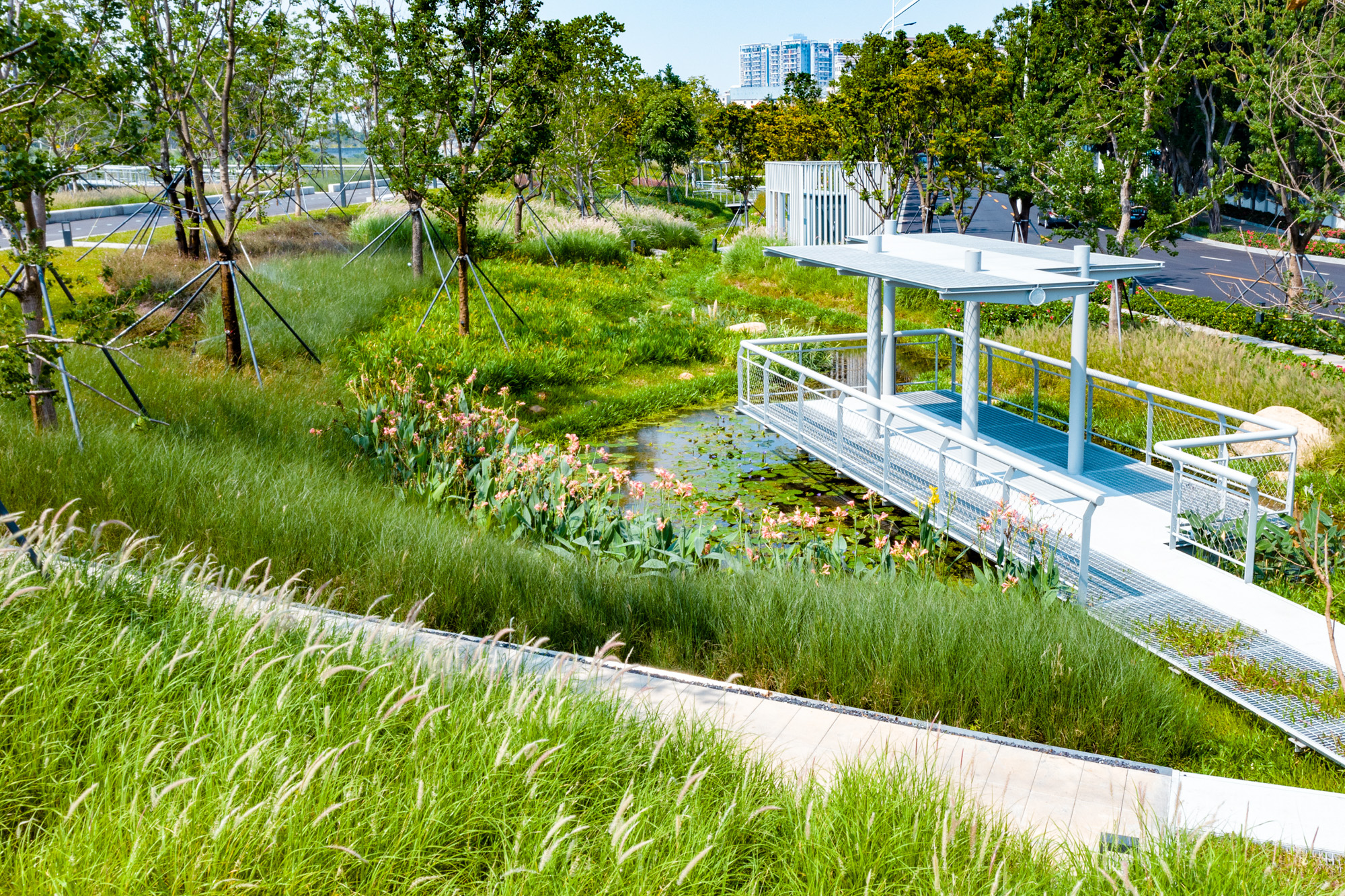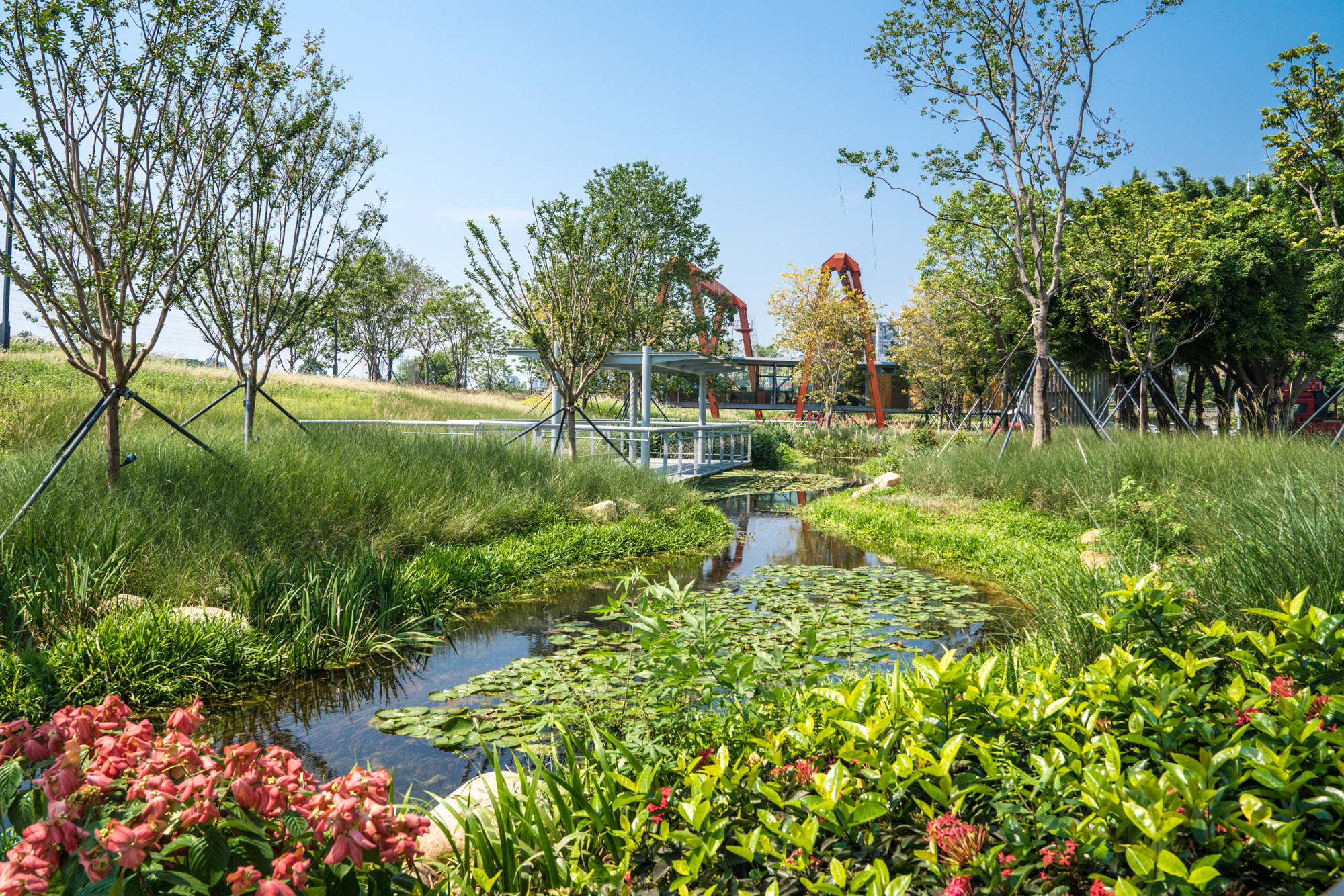 蜿蜒曲折的棧道穿梭在雨水花園與灘涂濕地之間,好像用一根線將二者緊密縫合,并圍合出大大小小的活動空間,滿足周邊居住及工作人群的活動需求。而濕地以松崗水質(zhì)凈化廠處理后的中水為水源,選用花菖蒲、千屈菜等本地水生植物和柳葉馬鞭草、藍(lán)雪花等觀賞草穿插種植,利用高差和生物凈化原理,對水質(zhì)進(jìn)行多層次的過濾凈化。