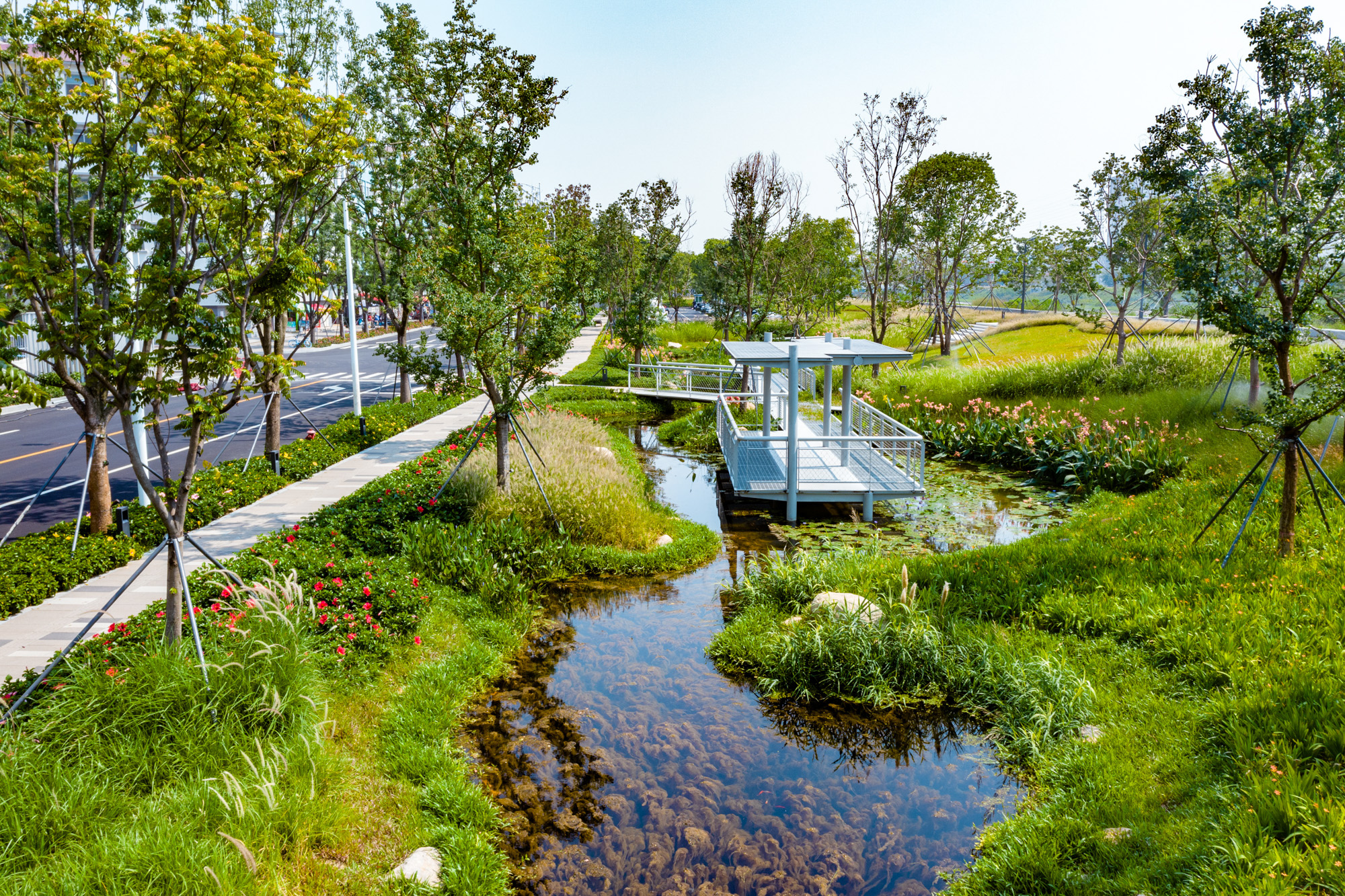 以中水為水源,通過濕地植物對水質(zhì)進(jìn)行層層凈化,處理后的水體用于園區(qū)綠化灌溉及市民親水體驗(yàn)。