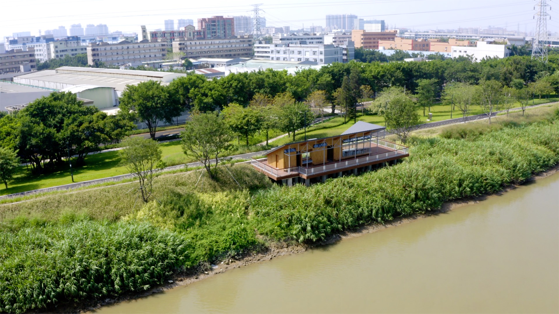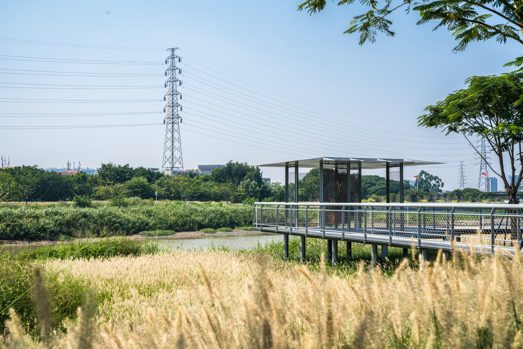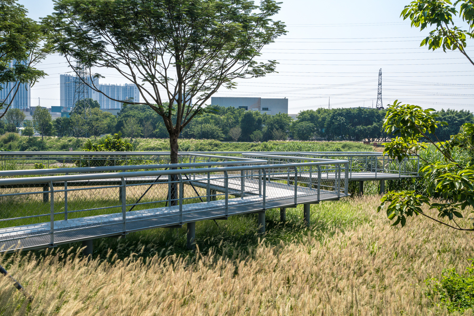 “懸亭靜泊”驛站將作為供游客休憩的咖啡館,特別保留了場地內(nèi)原有的龍門架,形成別具特色的門戶標(biāo)志,也成為引領(lǐng)濕地路徑系統(tǒng)的龍頭。茅洲河兩岸原本就有許多工廠,通過這種方式喚醒人們的工業(yè)記憶,并形成生態(tài)景觀和休憩活動的復(fù)合共生。