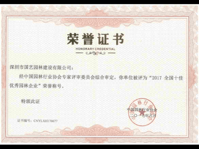 公司先后獲得中國(guó)園林綠化行業(yè)優(yōu)秀企業(yè)、全國(guó)十佳園林養(yǎng)護(hù)企業(yè)、全國(guó)十佳園林工程企業(yè)、全省十佳景觀(guān)設(shè)計(jì)機(jī)構(gòu)、廣東省林業(yè)龍頭企業(yè)、深圳市時(shí)花生產(chǎn)優(yōu)秀企業(yè)等眾多榮譽(yù)稱(chēng)號(hào),被評(píng)為廣東省誠(chéng)信示范企業(yè),連續(xù)十年被評(píng)為廣東省“守合同重信用”企業(yè)。一塊塊獎(jiǎng)匾、一張張獎(jiǎng)狀、一尊尊獎(jiǎng)杯,記錄著國(guó)藝闊步前行的歷史步履,見(jiàn)證了國(guó)藝園林蓬勃興盛的發(fā)展軌跡,留下了濃墨重彩的輝煌記憶。