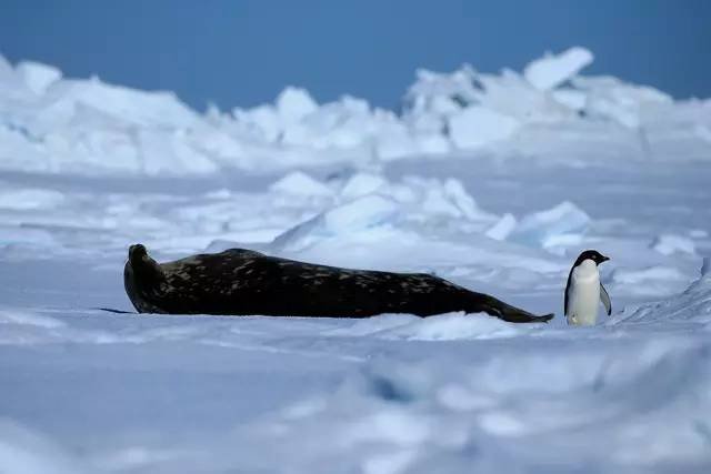 海豹是海洋性的哺乳動(dòng)物, 是鰭足類(lèi)中分布最廣的一類(lèi)動(dòng)物,從南極到北極,都有海豹的蹤影。一只海豹在雪地玩耍,一只企鵝在旁很悠閑,共同生存。