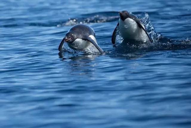 阿德利企鵝生存在南極大陸,分布廣泛,是南極最常見(jiàn)的企鵝品種之一。它們是高度熟練的游泳者,在大海里非常靈活,2只企鵝在水里嬉戲,十分敏捷。
