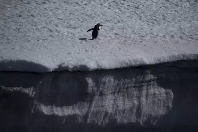 海水清澈,岸邊冰雪堆積,相映生輝, 別有一番洞天。一只企鵝在岸邊跳躍前行,凝視著遠(yuǎn)方的企鵝伙伴,身姿可愛(ài)。