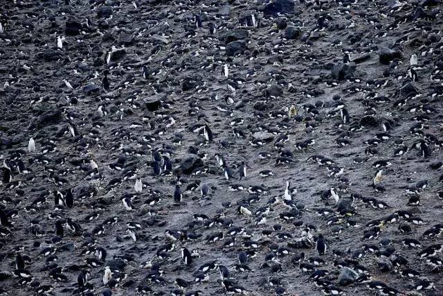 在一塊空曠的陸地上,散落著大大小小的巖石塊,數(shù)不勝數(shù)的企鵝集聚在一起,有很多企鵝正在碎石搭建的小窩孵化,場(chǎng)面震撼。