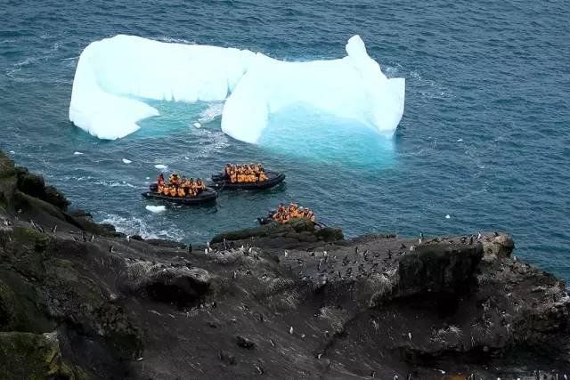 兩塊巨大的冰川,漂浮在海面,三艘皮劃艇上坐滿(mǎn)了前來(lái)考察的人,岸邊的巖石上企鵝密布。大海、冰川、企鵝,自然和人類(lèi),生命和探索不止。
